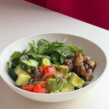 pui, mix salata, avocado, sos muștar, roșii, mix semințe.
