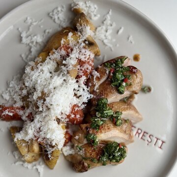 Șold de pui, brânză de capră, cartofi, ciuperci, roșii cherry, sos chimichurri.